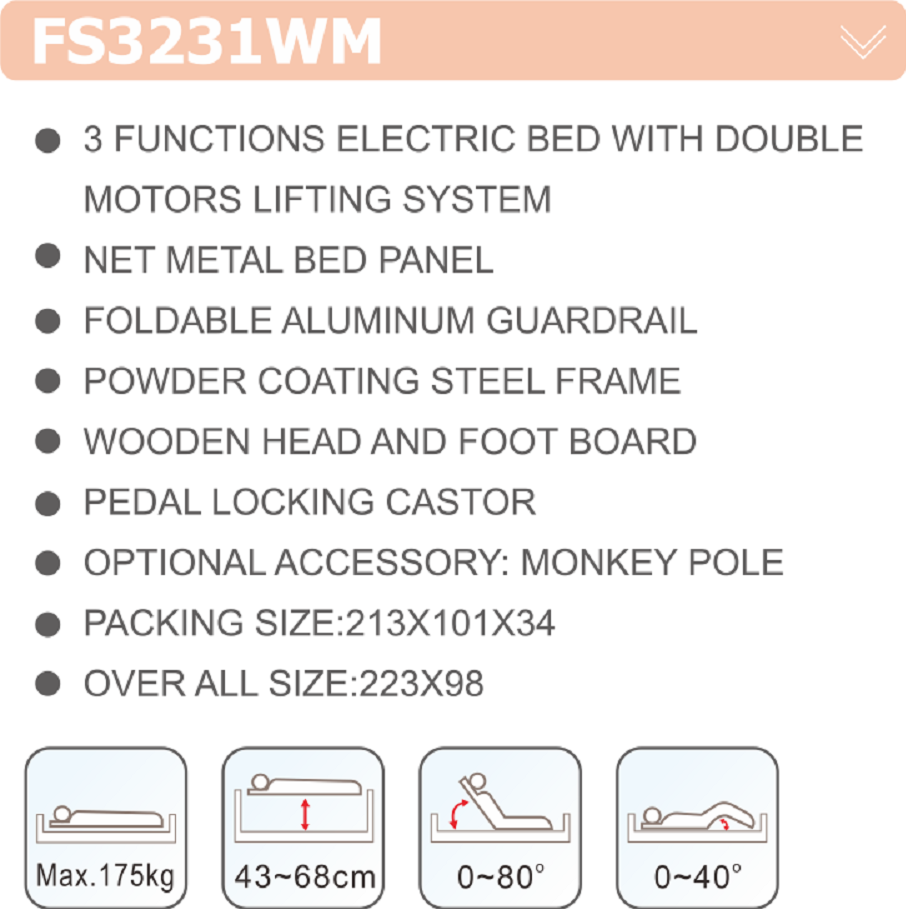 A Hospital Bed orhospital cotis a bed specially designed for hospitalized patients or others in need of some form of health care. These beds have special features both for the comfort and well-being of the patient and for the convenience of health care workers. Common features include adjustable height for the entire bed, the head, and the feet, adjustable side rails, and electronic buttons to operate both the bed and other nearby electronic devices.